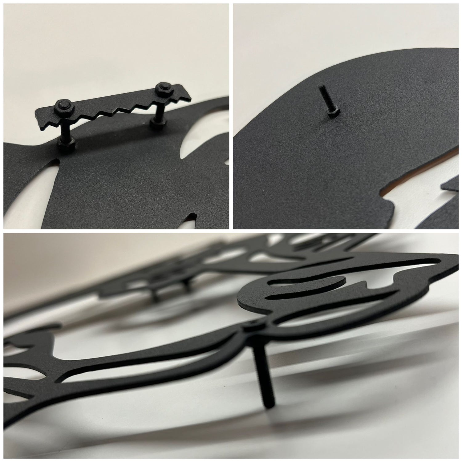 Precision laser-cut from durable 2mm metal, hand-polished, and coated in long-lasting matte black paint. The attached hanger simplifies single-nail mounting, while included screws create a dimensional 3D effect.
